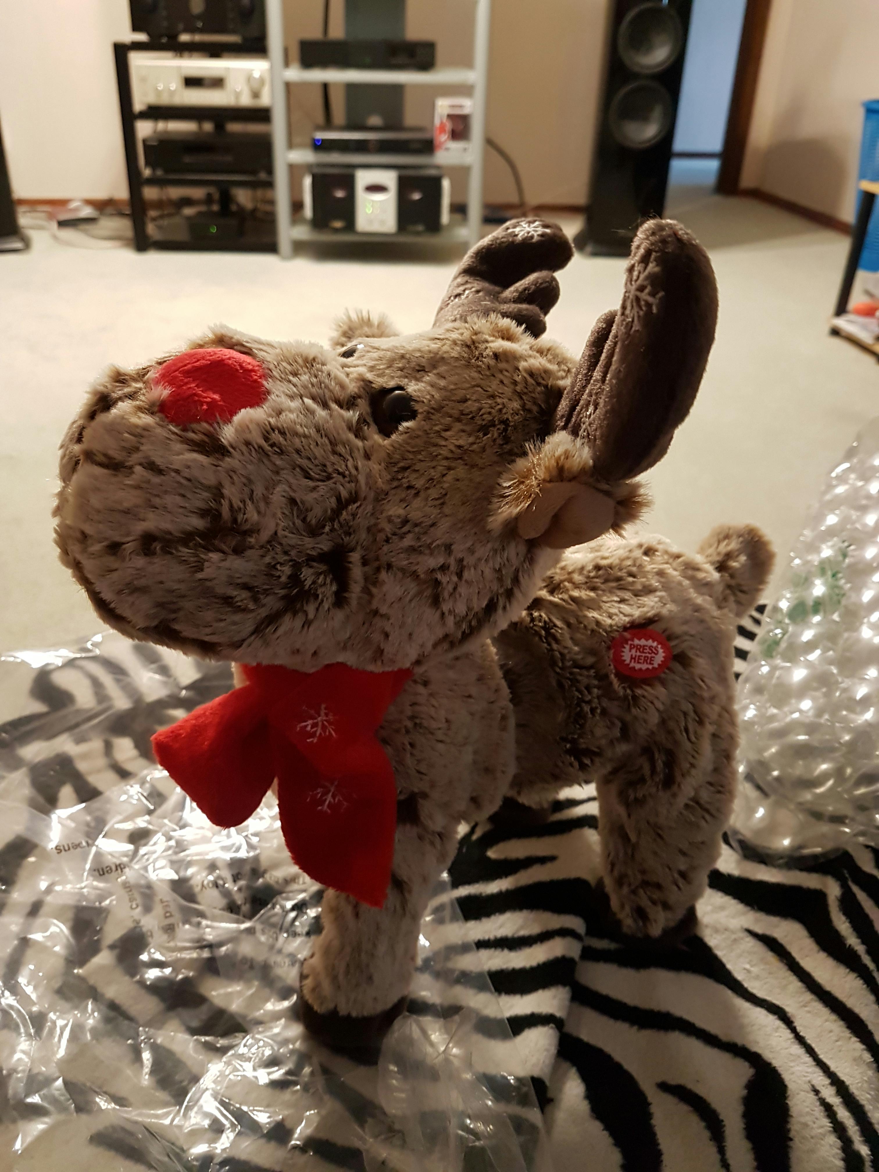 This Animated Walking and Singing Reindeer with a soft fluffy finish, makes him perfect for cuddles, he's beautifully detailed with antlers and a red scarf to match his nose.